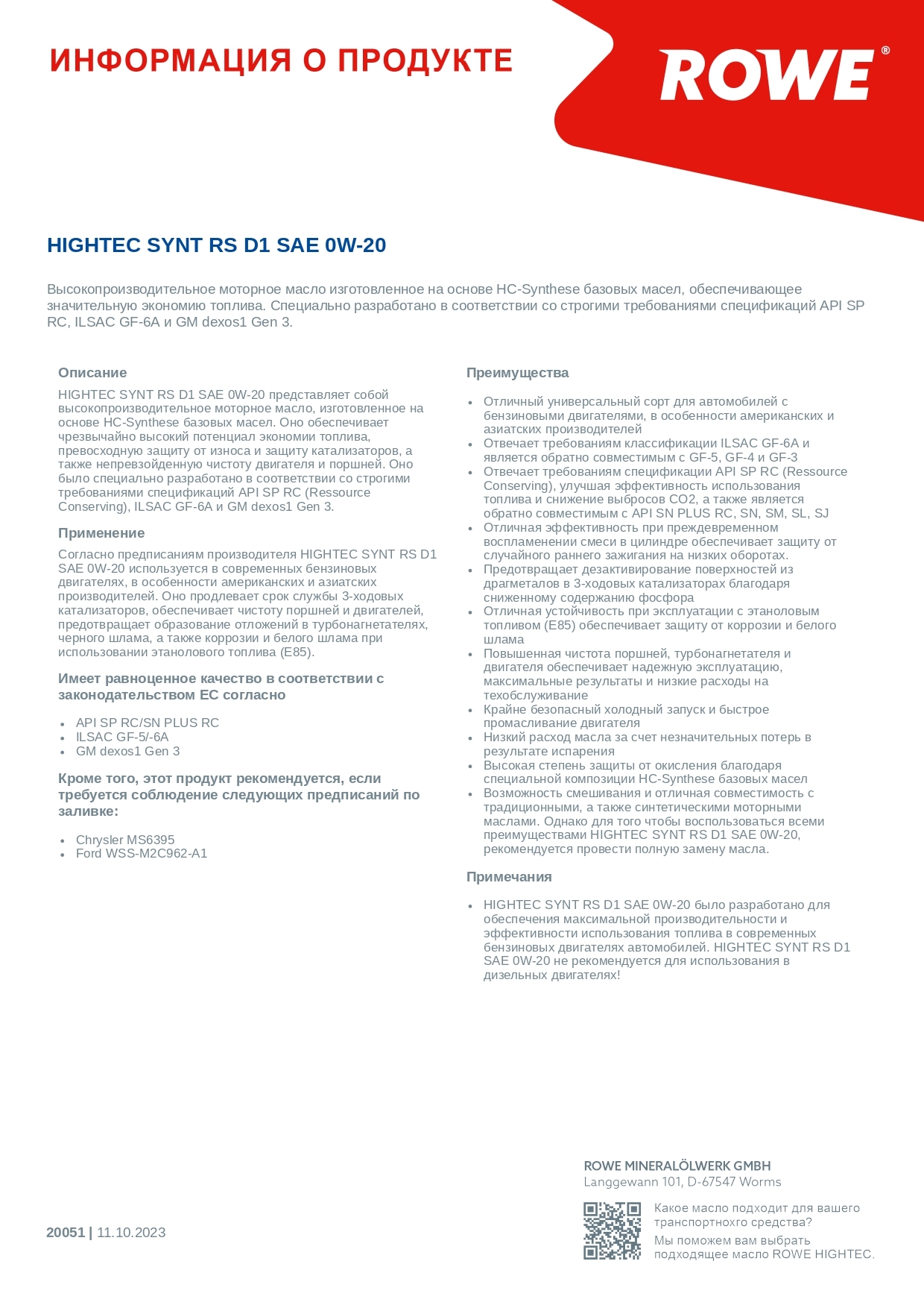 HIGHTEC SYNT RS D1 SAE 0W-20 представляет собой высокопроизводительное моторное масло, изготовленное на основе HC-Synthese базовых масел. Оно обеспечивает чрезвычайно высокий потенциал экономии топлива, превосходную защиту от износа и защиту катализаторов, а также непревзойденную чистоту двигателя и поршней. Оно было специально разработано в соответствии со строгими требованиями спецификаций API SP RC (Ressource Conserving), ILSAC GF-6A и GM dexos1 Gen 3.